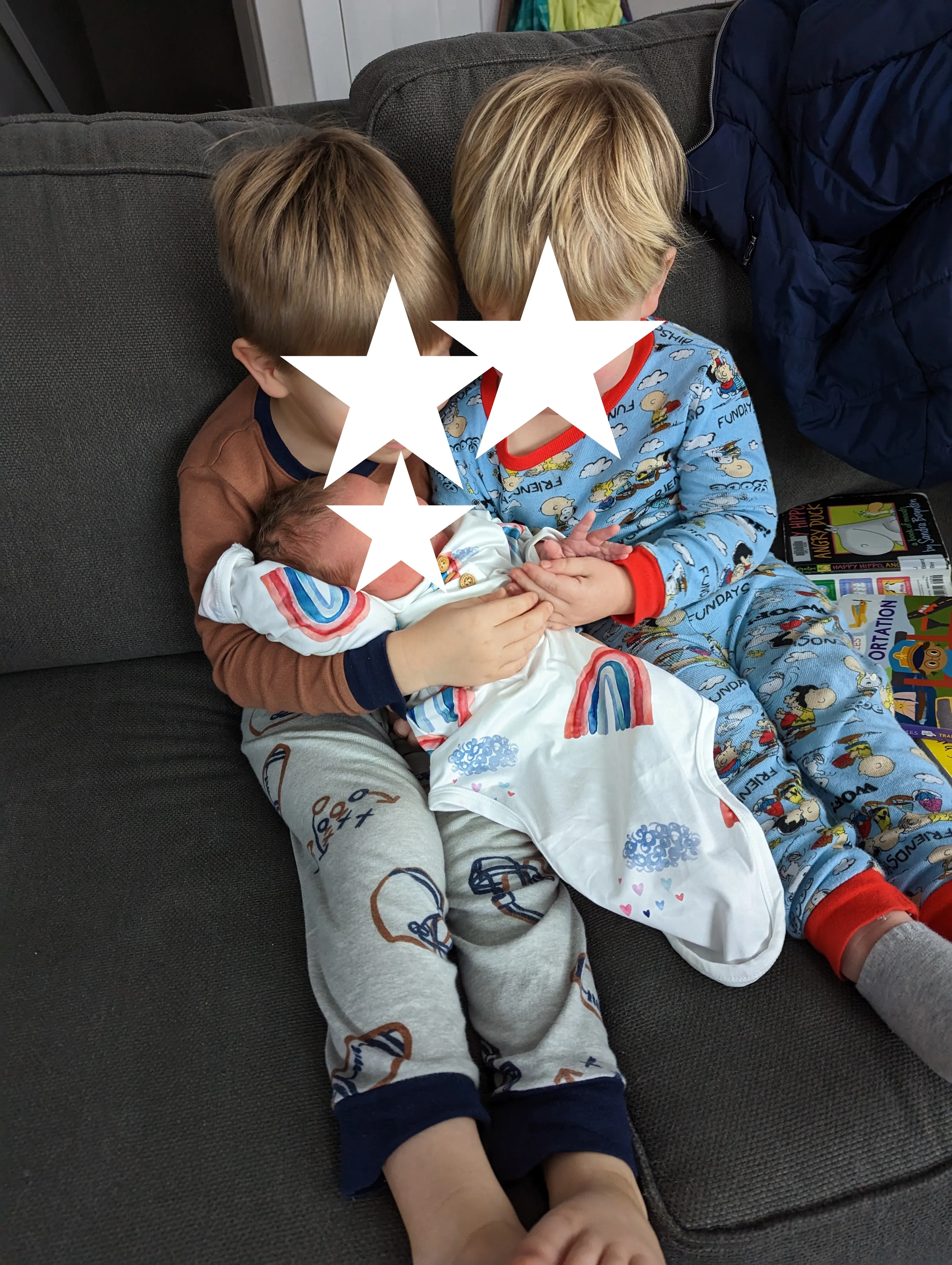 We had texted our moms that we were on our way home and that we were going to go to the front door to surprise the boys. So we rang the doorbell and walked in the door to 2 very surprised and excited little boys! We told them they had a little brother and told them his name, and while they were initially disappointed that he wasn’t a girl - they were excited to be able to hold him.