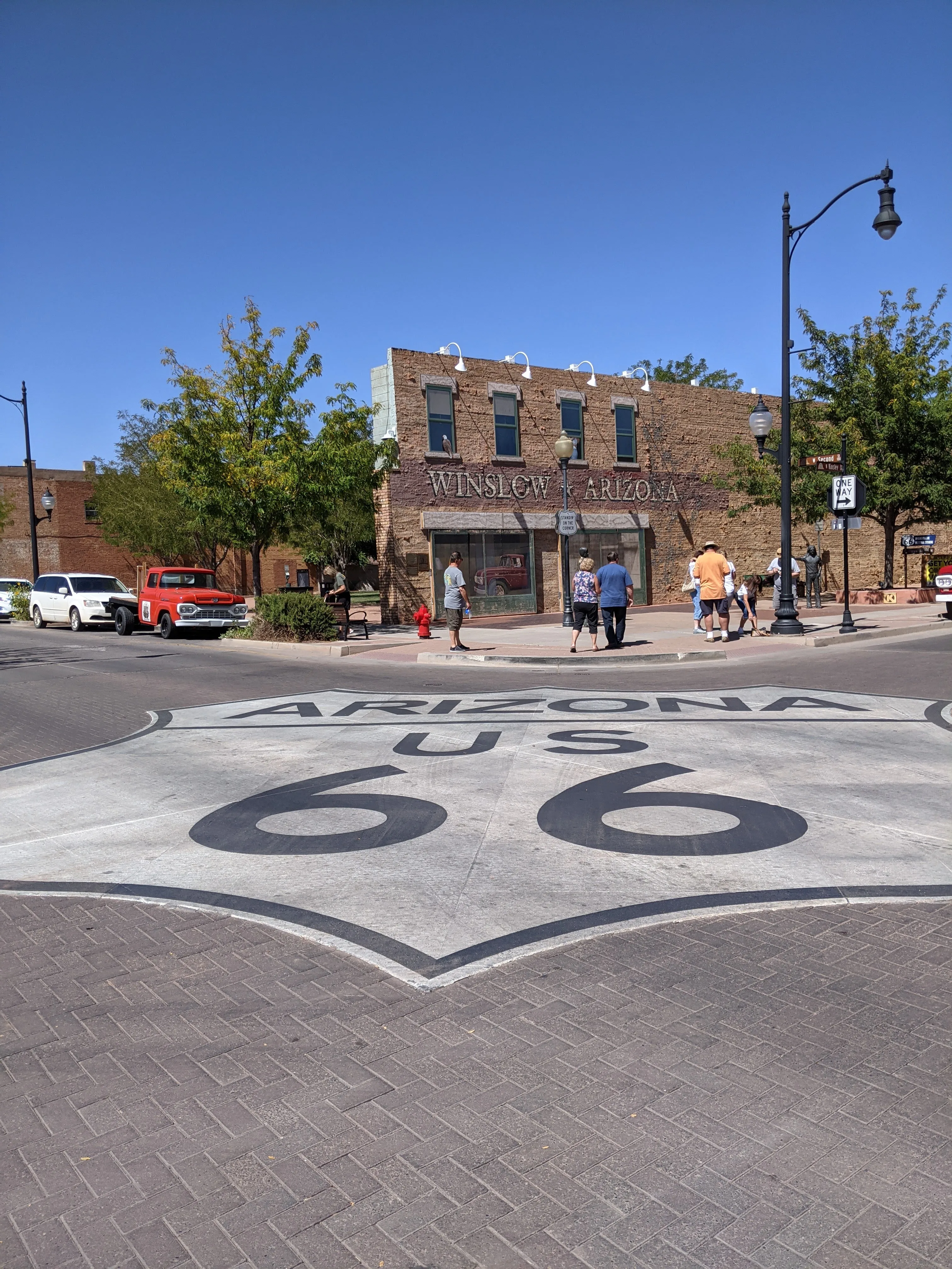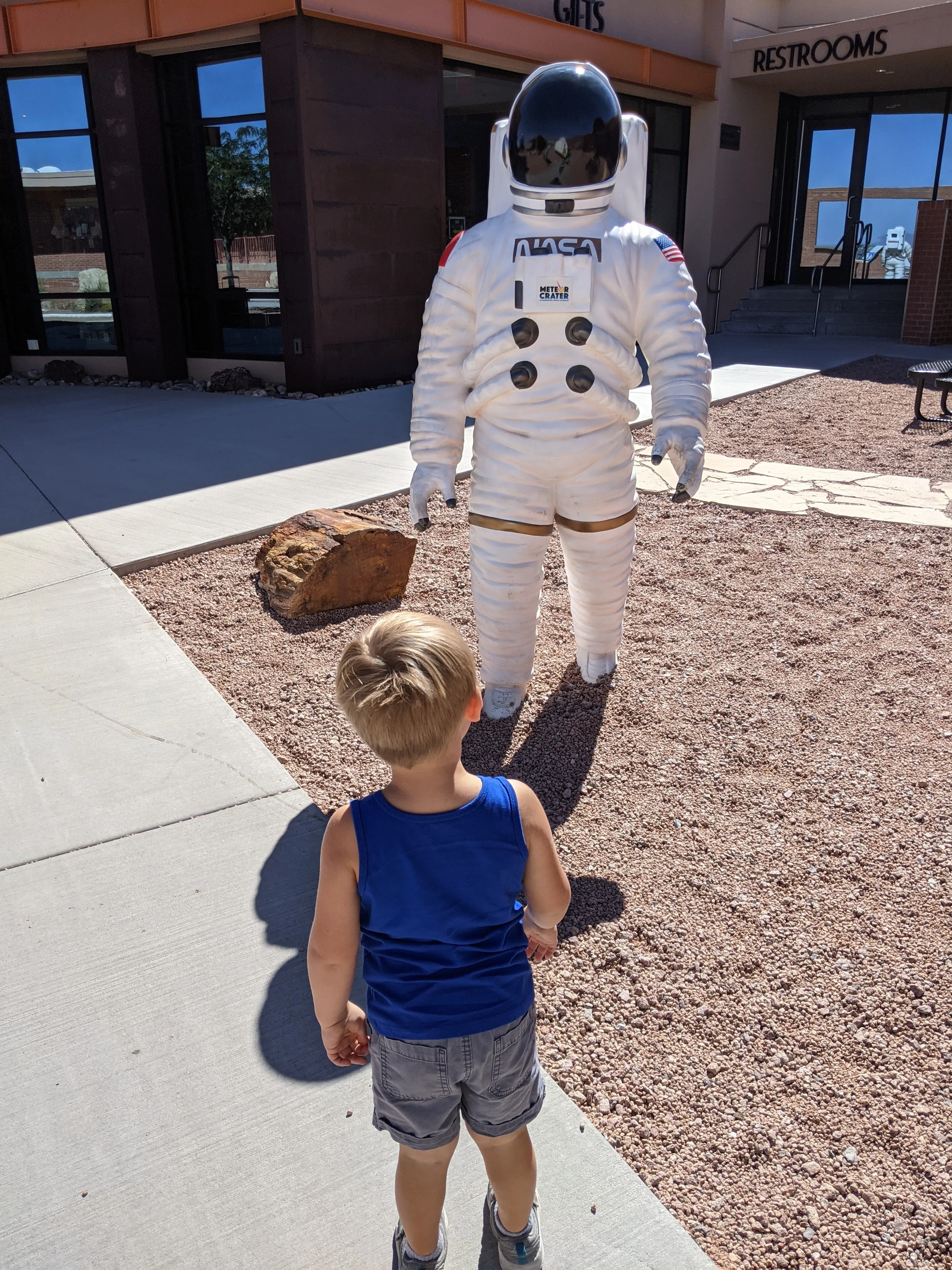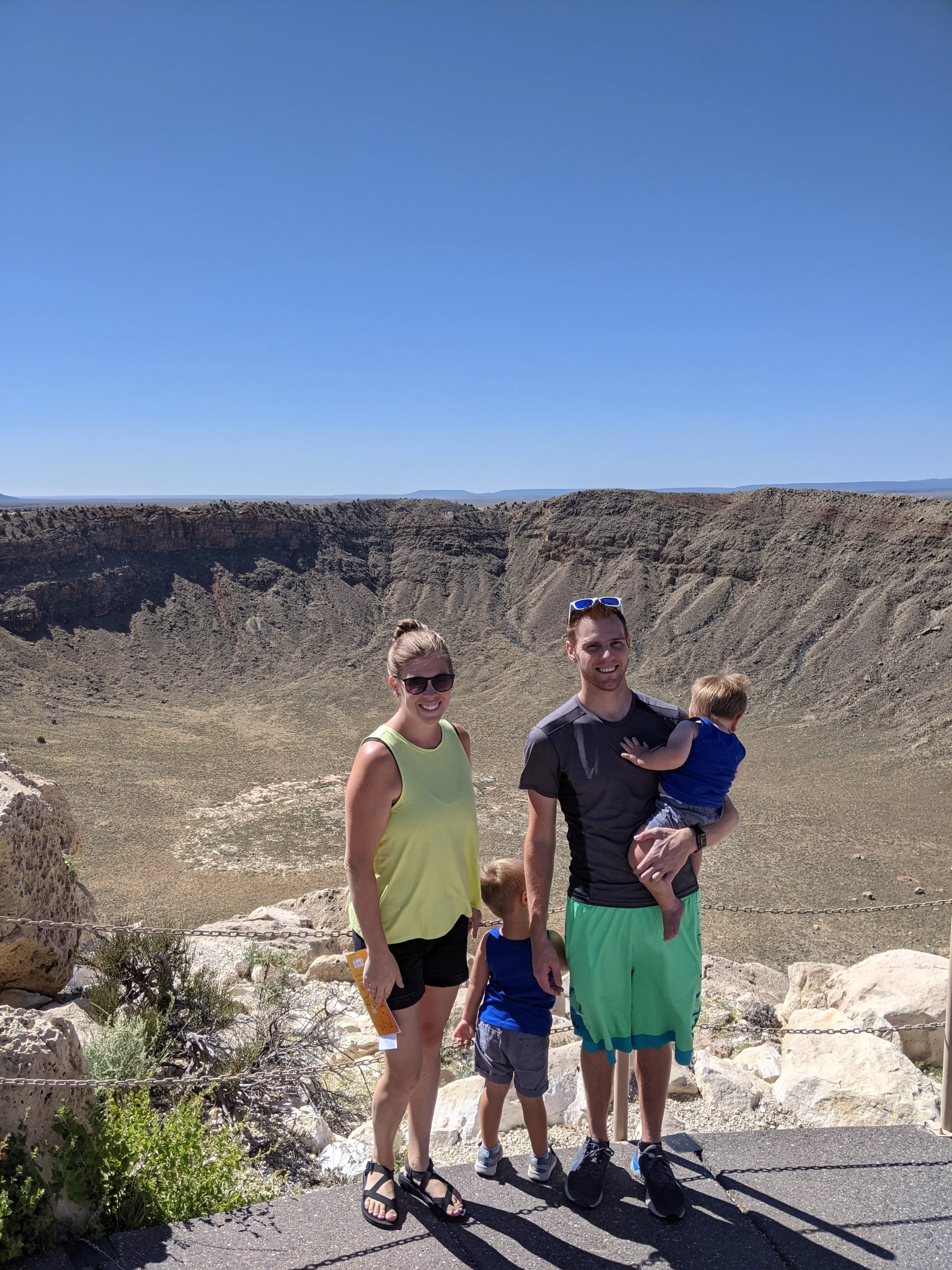 We had picked our route quite a bit before our actual road trip so we could plan out stops for fun and for the night. Our first leg was from Scottsdale to Albuquerque, NM. Along the way we decided to stop at the meteor crater outside of Winslow, and that was really really cool. The inside building had some cool things to look at for the boys and historical information for us to read. The actual crater itself is such a sight to behold. Before we left we had a picnic in the parking lot and then took off for Winslow to see the sights of old Route 66.